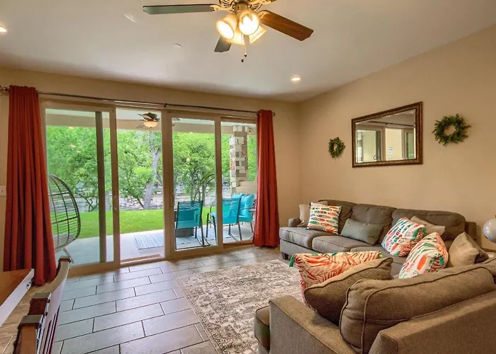 The spacious accommodations at this striking fortress are designed to provide the ultimate home-like experience. Each apartment boasts a well-equipped kitchen complete with a fridge, oven, and dishwasher, catering to both casual meals and gourmet cooking. Enjoy your mornings with a fresh brew in the living room, where air conditioning guarantees a cool escape from the Texas heat. Guests can unwind on the patio, savoring the serene atmosphere while enjoying the surrounding natural beauty.